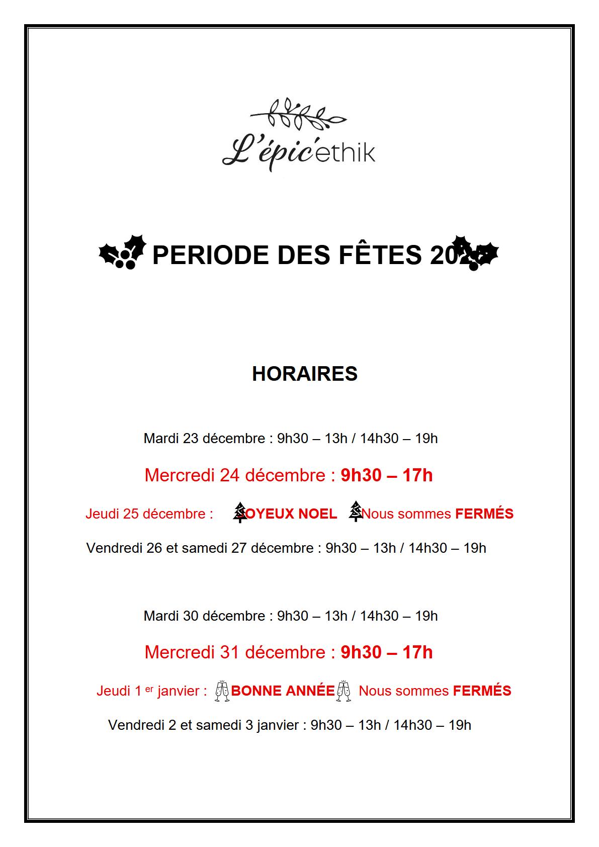 L’epic’ethik modife ses horaires pour la période des fêtes. A noter que le magasin sera ouvert les 24 et 31 décembre jusqu’à 17H. Bonnes fêtes
